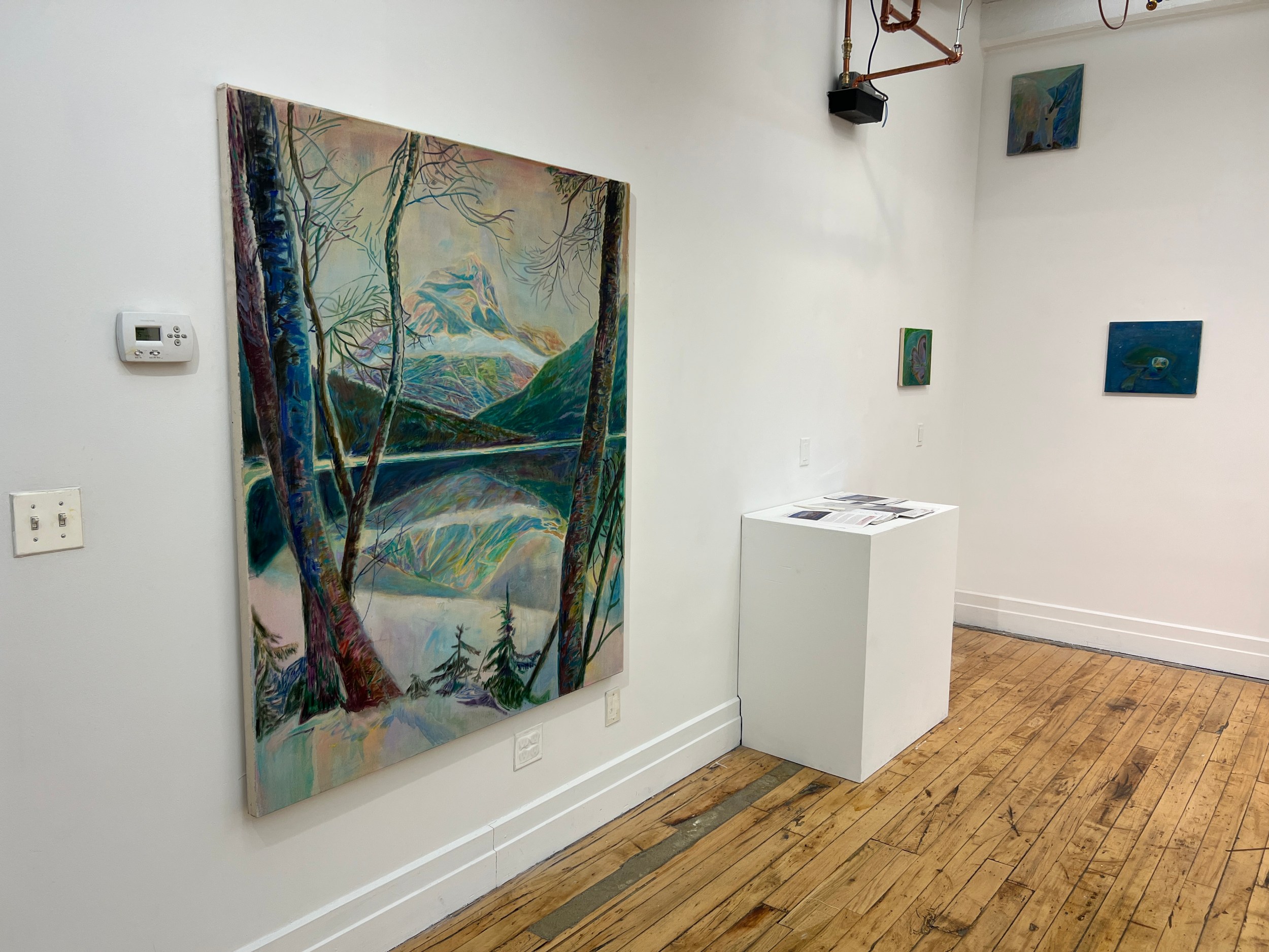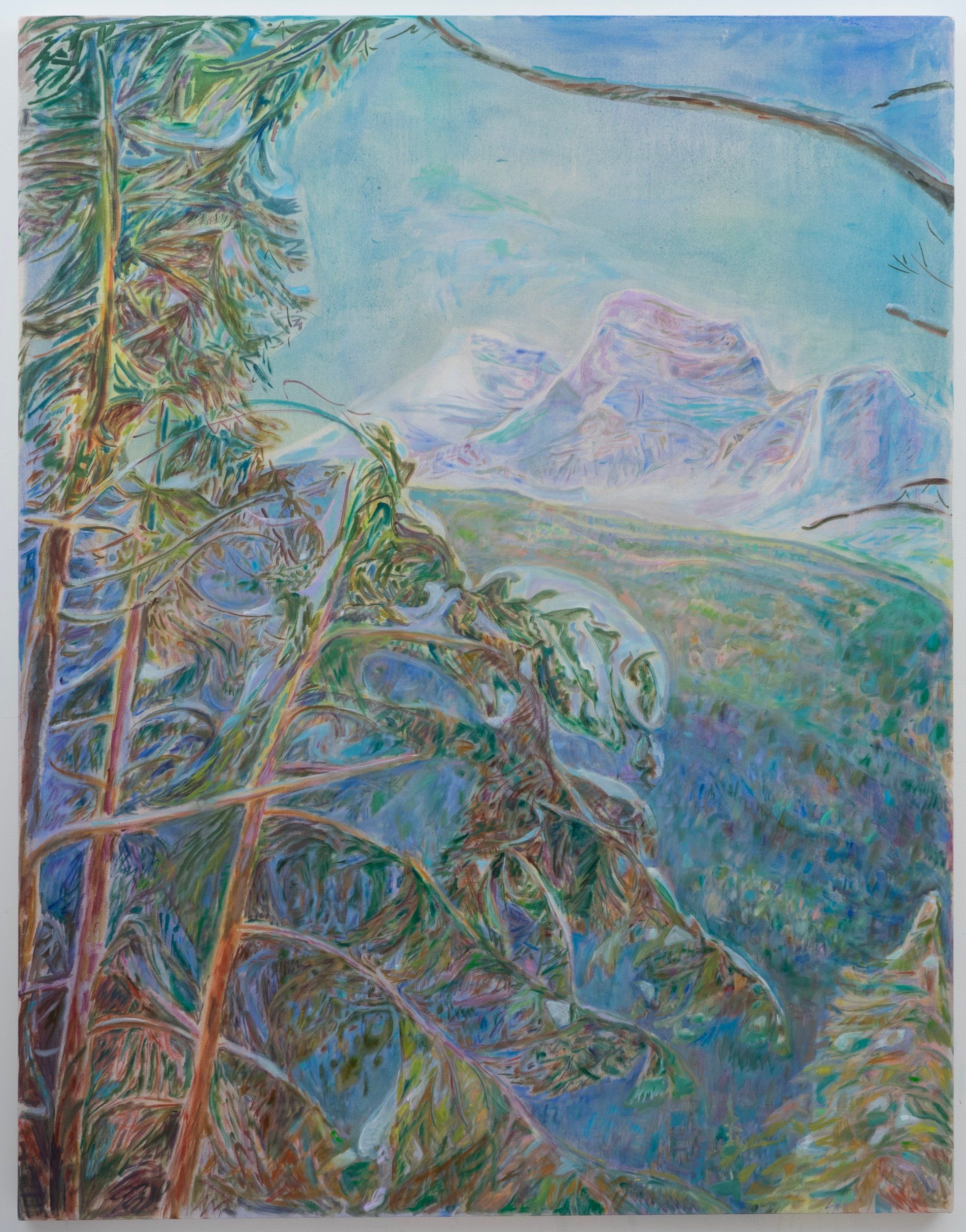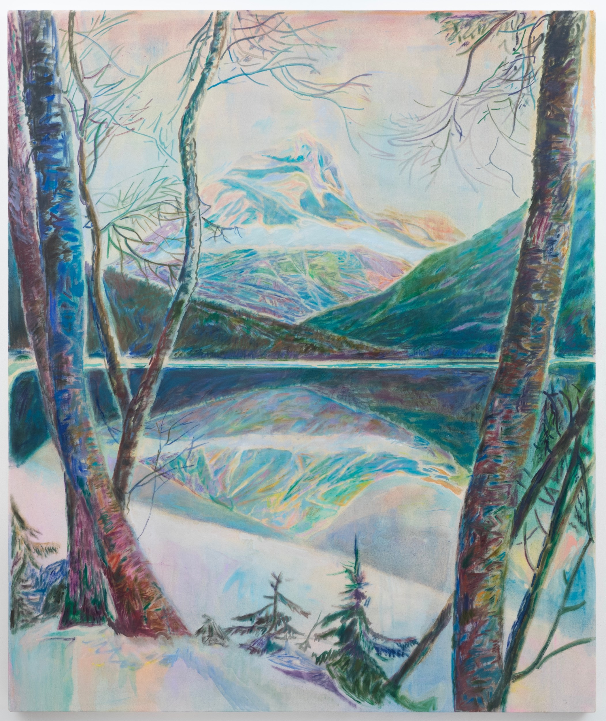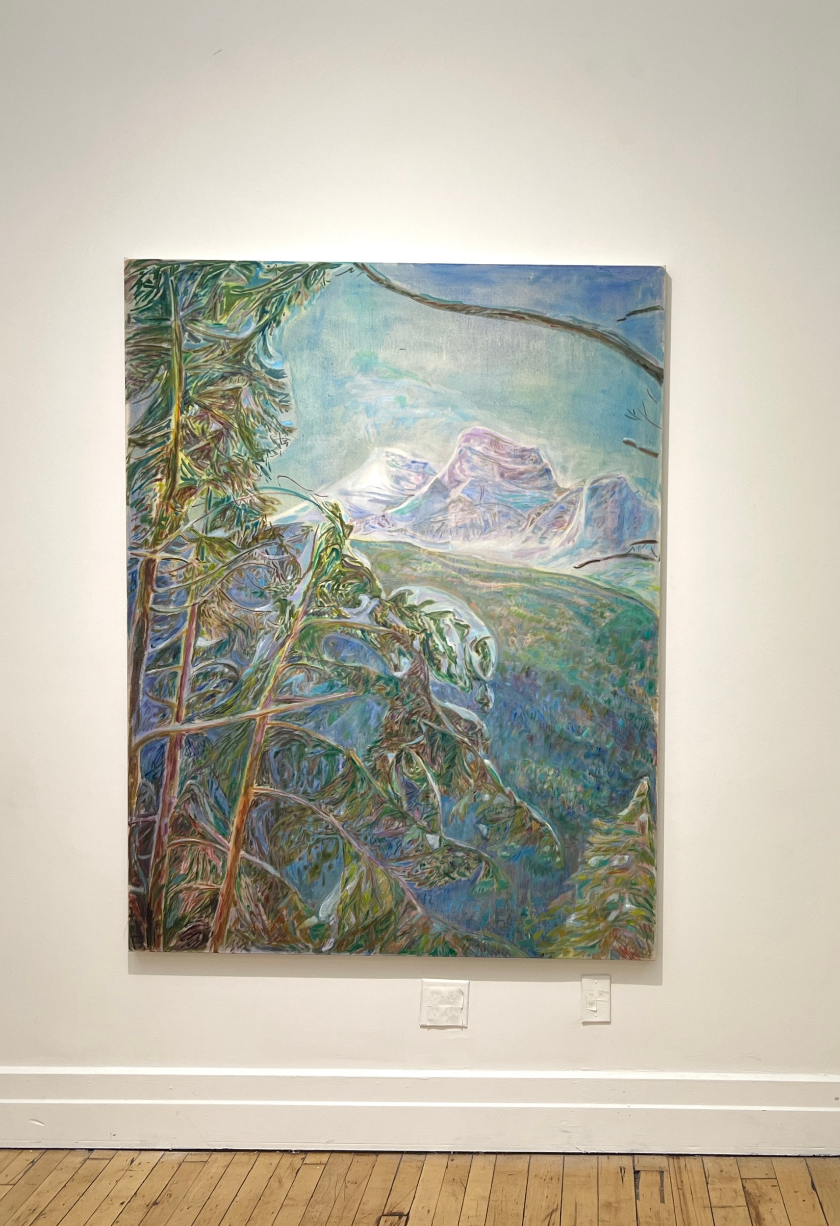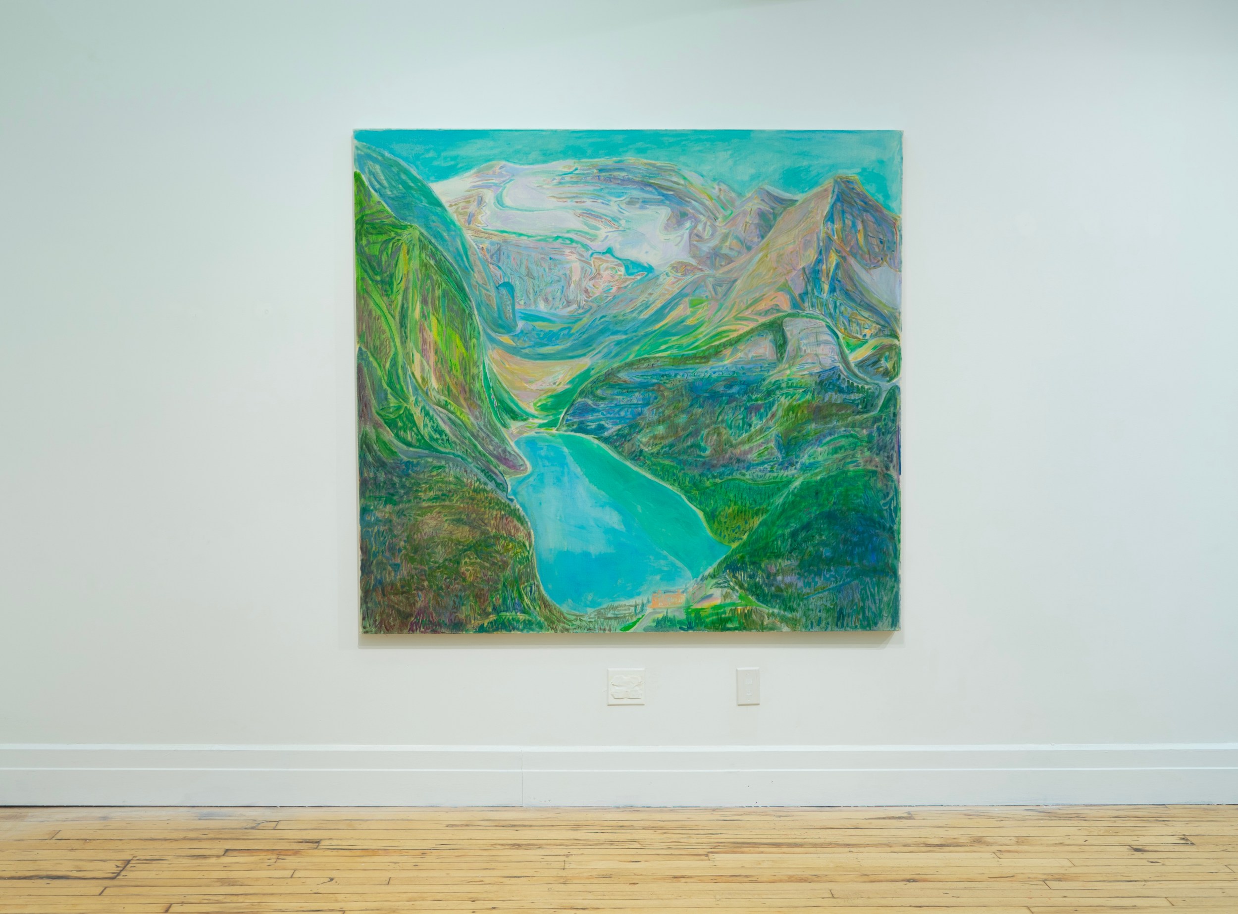 The four larger oils – 60 x 50 inches or 60 x 65 inches – encourage us to face the solemnity of Mother Nature and at the same time feel almost casually encountered. In between dabs of paint, the canvases breathe, hinting at a speed or facility in execution and imparting a lightness of touch. In Borca di Cadore, Kodachrome pinks and purples soften a distant rock formation’s boldness, receding into a scenic drapery beyond a thrust of trees jostling for prominence along the painting’s left side. In Lake Louise with Lodge, a bubble of turquoise nestles within a jittery landscape of brushstrokes, as steadfast as the mountains that overlook it. The two-toned lake resists settling quietly into implied space as it reflects the land rising at its edge.