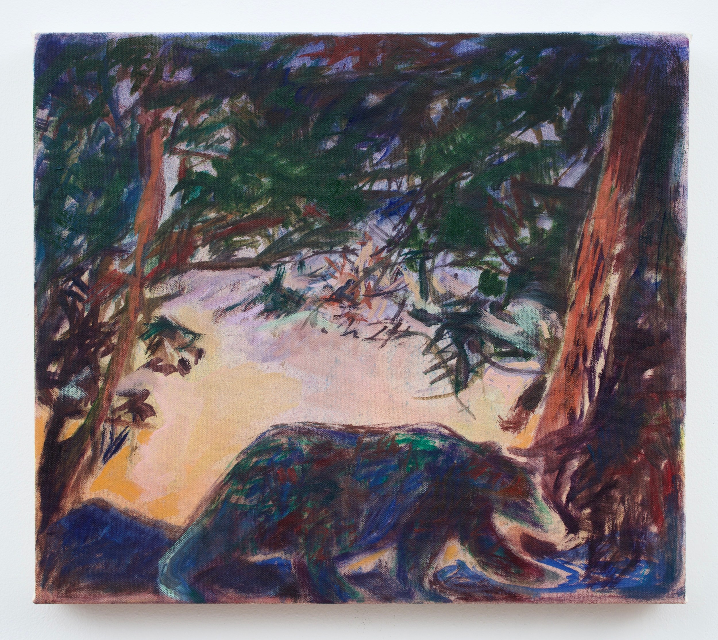 All feels at peace in these paintings – there are no humans around to muck things up. Weaving gestures effected by translucent swabs of color peppered with stumbly brushstrokes create moments of Fauvist vigor, distilling these vistas, at once grand and remote, into a kind of communion. The four smaller oils – 11 by 14 inches or 16 x 14 inches – highlight animals or insects. Perhaps because of the tighter field of vision, there’s less of a sense of wonder here, and they present as more matter-of-fact, like thumbnail images keyed to the wider world depicted in the larger work. They lend structure and cohesion to the show without detracting from its philosophical force. Brant cites the Japanese Buddhist poet Dögen Kegan post-Impressionists such as Pierre Bonnard, and Chinese landscape painters as inspirations. These influences are clear. The artist steps into the river, and the wide world is new again.