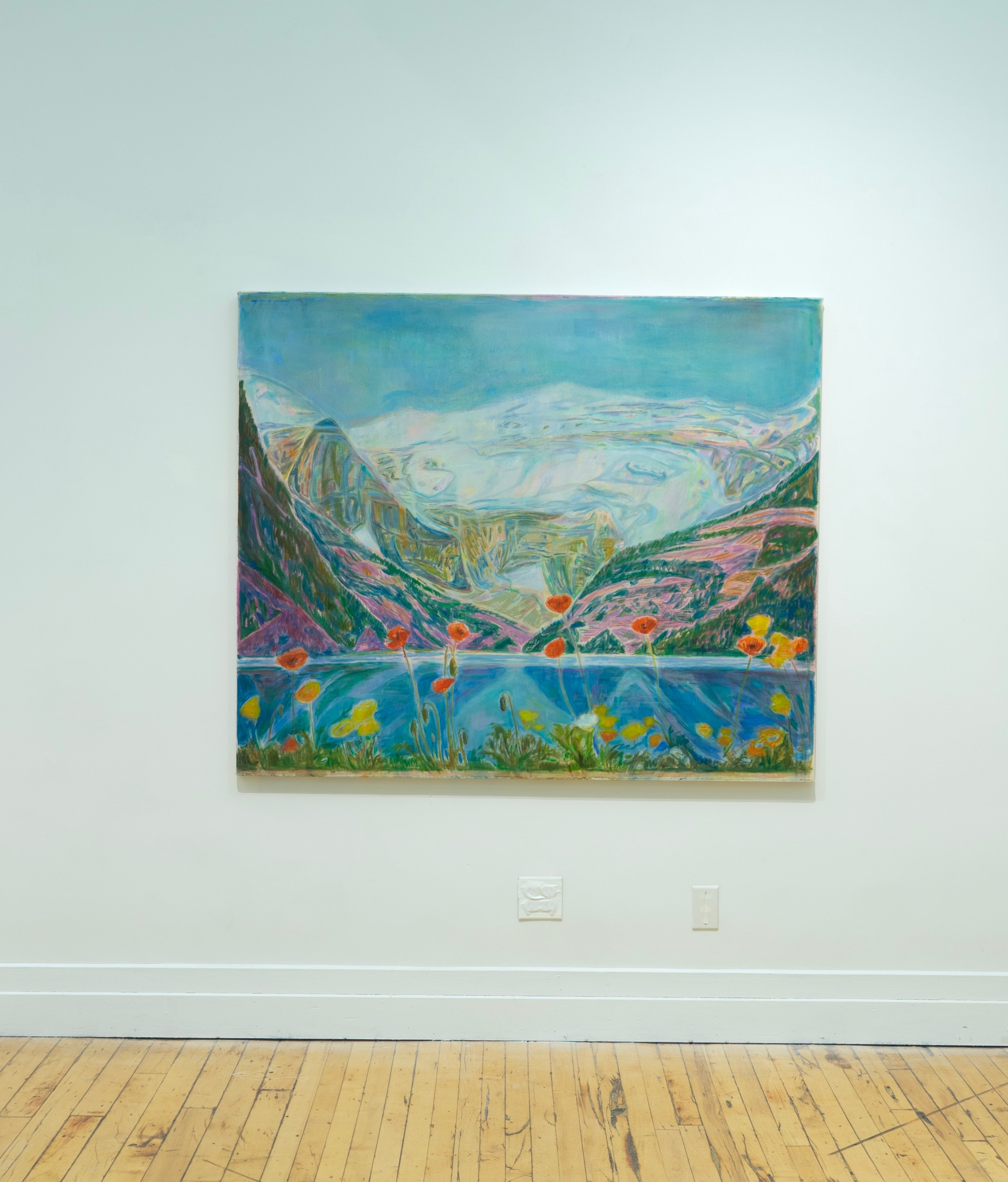 You might consider the title of Colin Brant’s quietly inspiring exhibition “Mountains Like Rivers,” currently on view at Platform Project Space, an invitation to a world flipped on its end: what’s inherently solid becomes liquid, what’s up is now down. You would not be entirely wrong. Indeed, in Lake Louise/Poppies, the eponymous body of water mirrors the snowy, majestic range that anchors the painting. Red and yellow poppies in the foreground form a joyous tassel punctuating the band of blue, their stems waving like the arms of children eager to be called on.